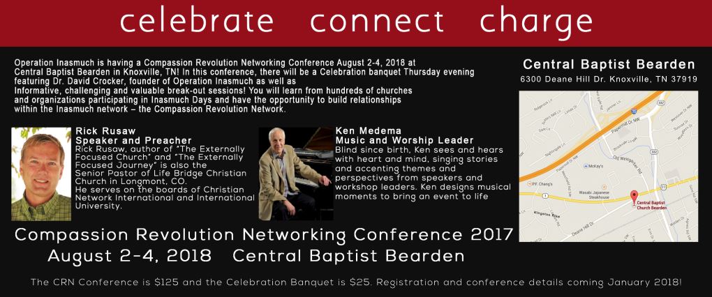 Operation Inasmuch, Inc. is hosting the first Compassion Revolution Network Conference August 2-4, 2018 in Knoxville TN. We’ve mailed out nearly 2,000 “Save-the-Date” cards, and posted information on our Facebook page, and a conference website will soon be up linked from www.operationinasmuch.org.